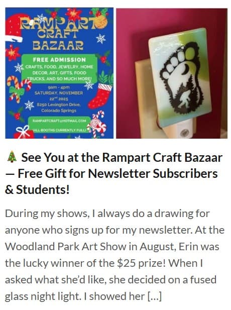 As I look back on the year, I’m proud of the progress I made, the lessons I learned, and the joy that glass continues to bring into my life. Some goals were met, some were reshaped, and a few are still works in progress—but all of them helped guide my creative journey. Teaching, learning, giving back, and continuing to grow as both an artist and a business owner remain at the heart of what I do. As I plan for the year ahead, I’d love your input. What else should I do this year with my glass? Are there projects you’d love to see, classes you’ve always wanted to take, or ideas you think I should explore? Please feel free to share your thoughts—I truly value this community and the inspiration we give each other. Thank you for being part of my glass journey. I can’t wait to see what the next year brings.