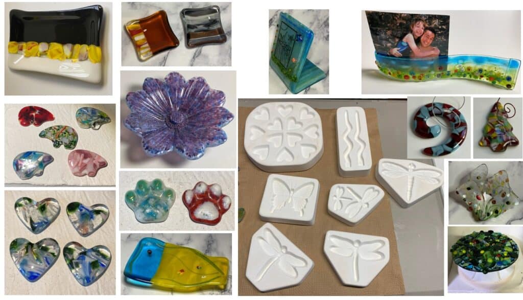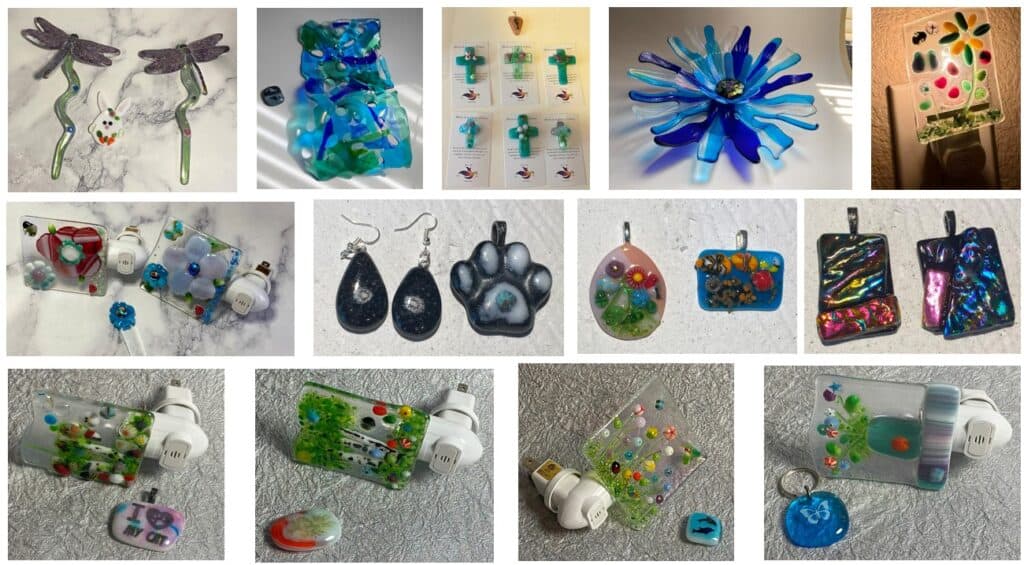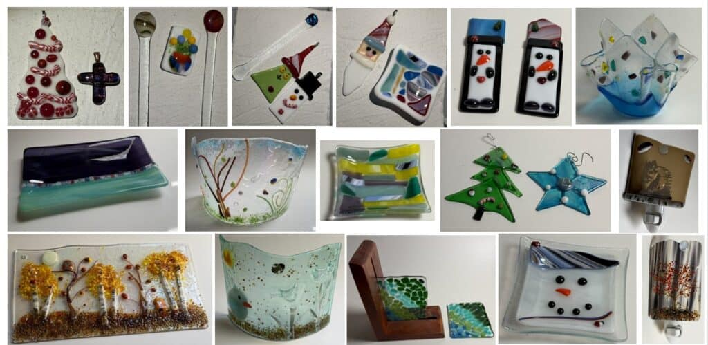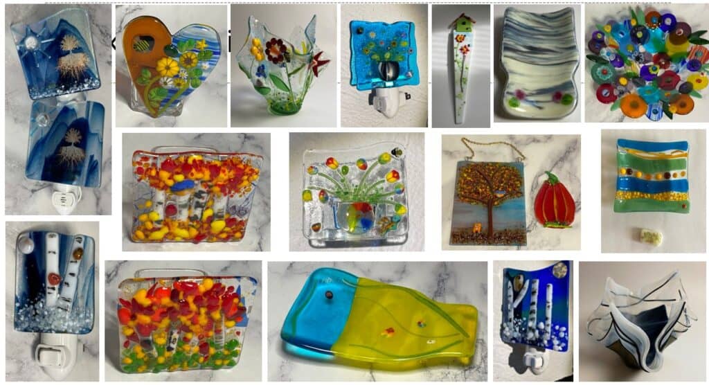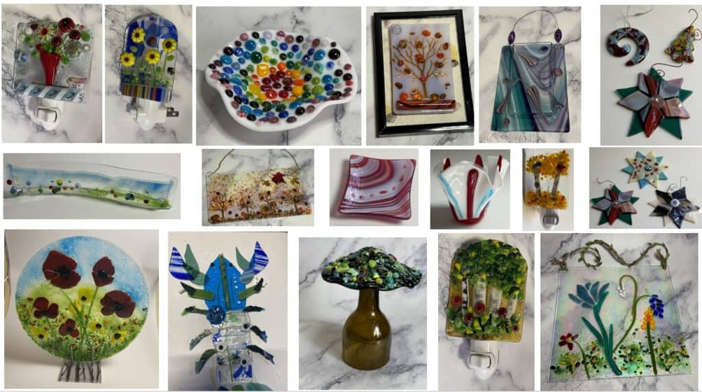 My first goal for both 2025 and 2026 is simple: teach more fused glass classes. Anyone who has taken a class with me knows just how much I love teaching, so this goal felt like a natural fit. There’s nothing better than watching someone’s confidence grow as they turn a pile of glass into something uniquely their own. In 2024, I taught 15 classes. In 2025, I taught 34 classes—more than doubling the number of classes from the year before. That growth didn’t just mean more time in the studio for me; it meant more creativity, more laughter, and more incredible student work coming out of those kilns. Throughout the year, my students created everything from jewelry and ornaments to nightlights and large statement art pieces. No two classes were ever the same, and seeing each person’s style come through their work is one of the most rewarding parts of teaching. Below are just a few examples of the beautiful pieces my students created this year.