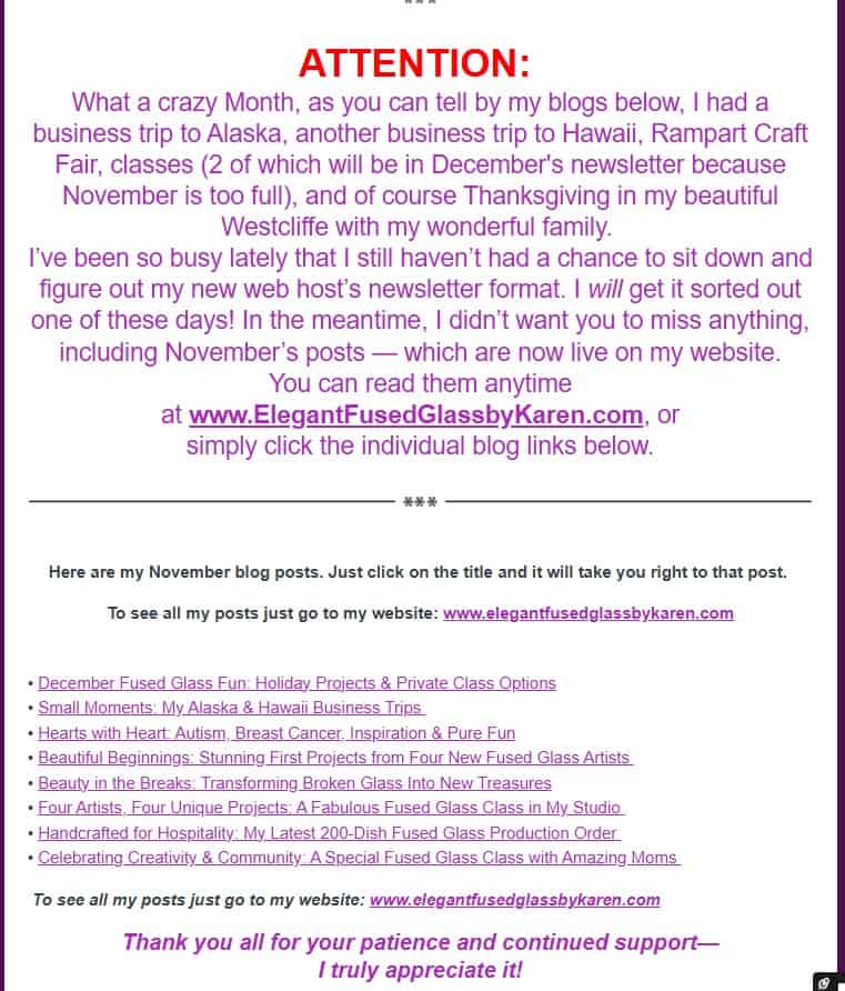If you would like to see more of my fused glass work, please refer to my website Elegant Fused Glass by Karen. If you get a chance, check out all my site and my Elegant Fused Glass by Karen YouTube. If you’d like to take a class please check out the information on my site about my classes. If you would like to stay abreast of what I’m up-to check out our newsletter. It is published the last day of each month.