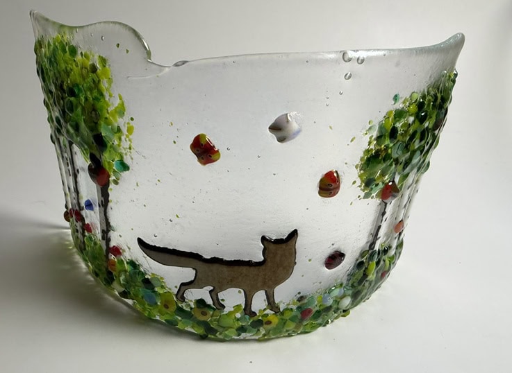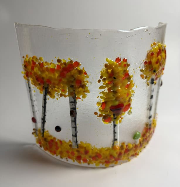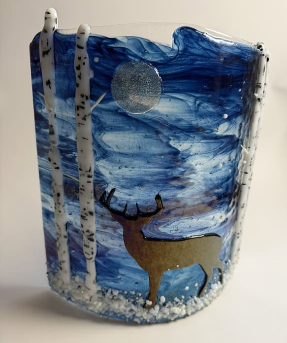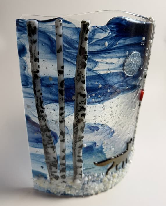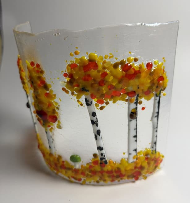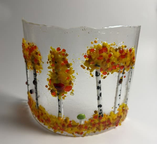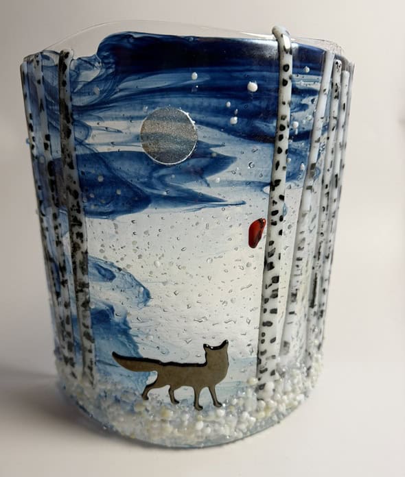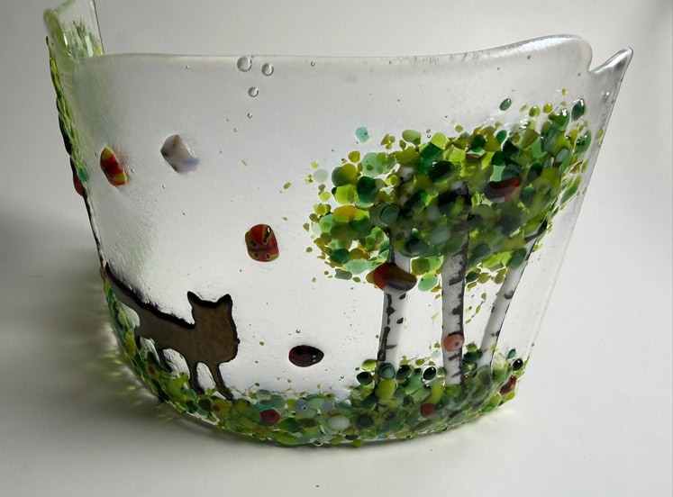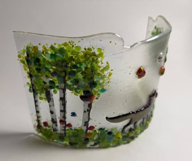 Aspens are one of my favorite art pieces I make in fused glass. Living in Colorado, I’m surrounded by these lovely trees, and I never get tired of their movement, their quiet beauty, or the way they change with the seasons. I also love incorporating the animals we’re lucky to see here—deer, bears, and foxes—because they feel so much a part of the landscape.