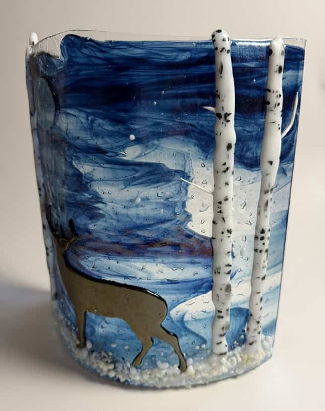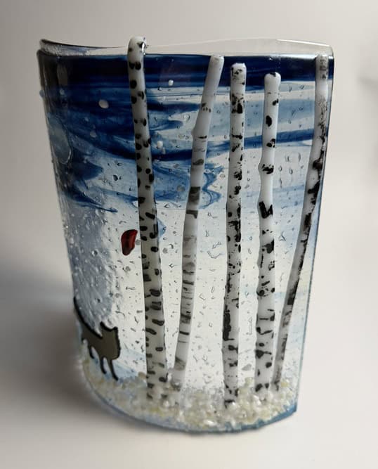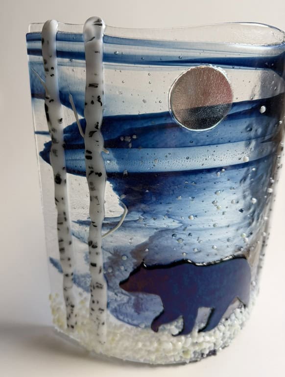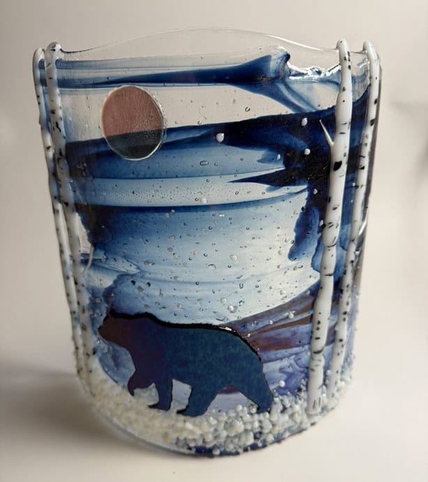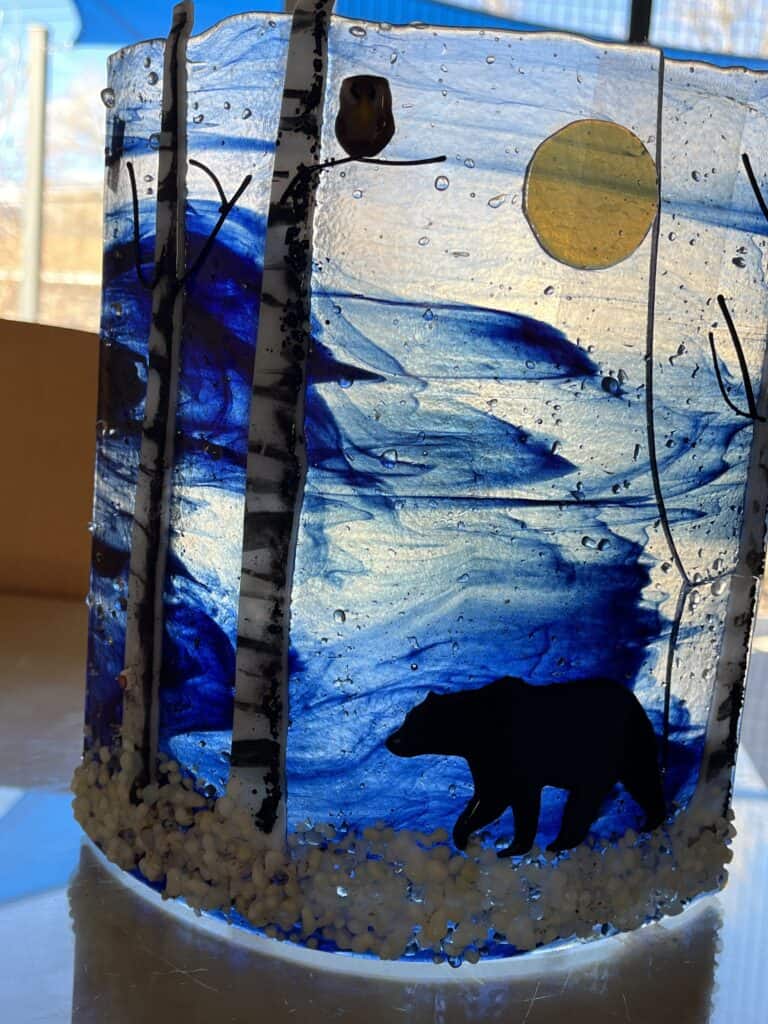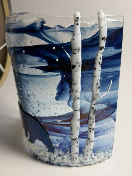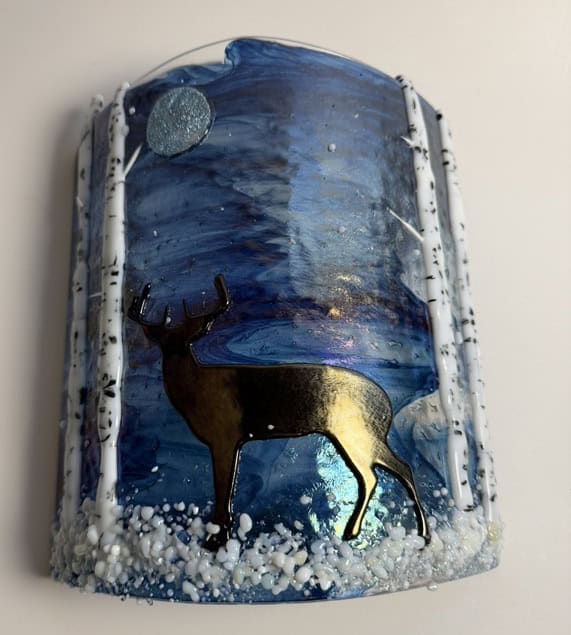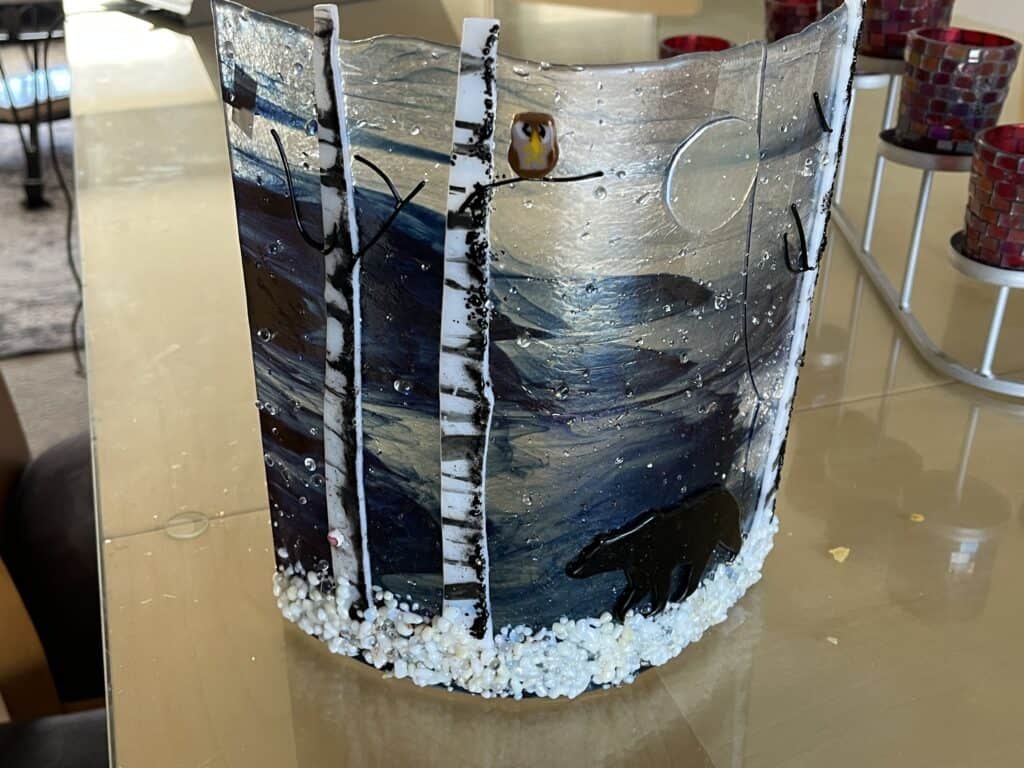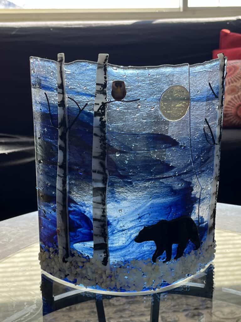 I made her a fused glass aspen sconce, and honestly, the glass did a lot of the talking. The blues came together beautifully, creating that soft, moody winter sky that I love so much. I tucked an iridized bear into the scene, along with hand-painted aspens, which gave the whole sconce depth and just a hint of quiet wildlife movement. Between the flowing glass, the shimmer of the bear, and the snowy details at the base, it truly feels like a peaceful winter moment captured in glass. Most importantly she loved it.