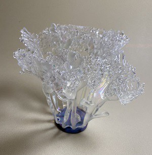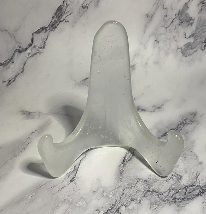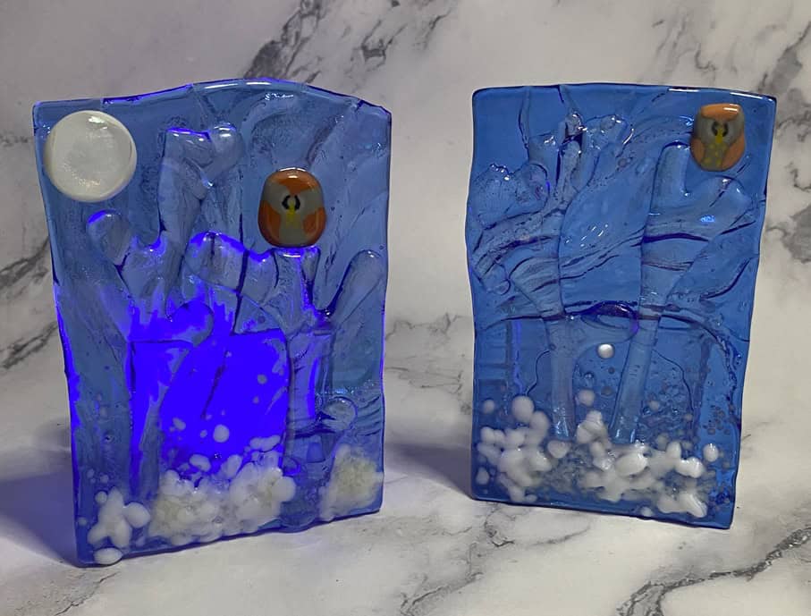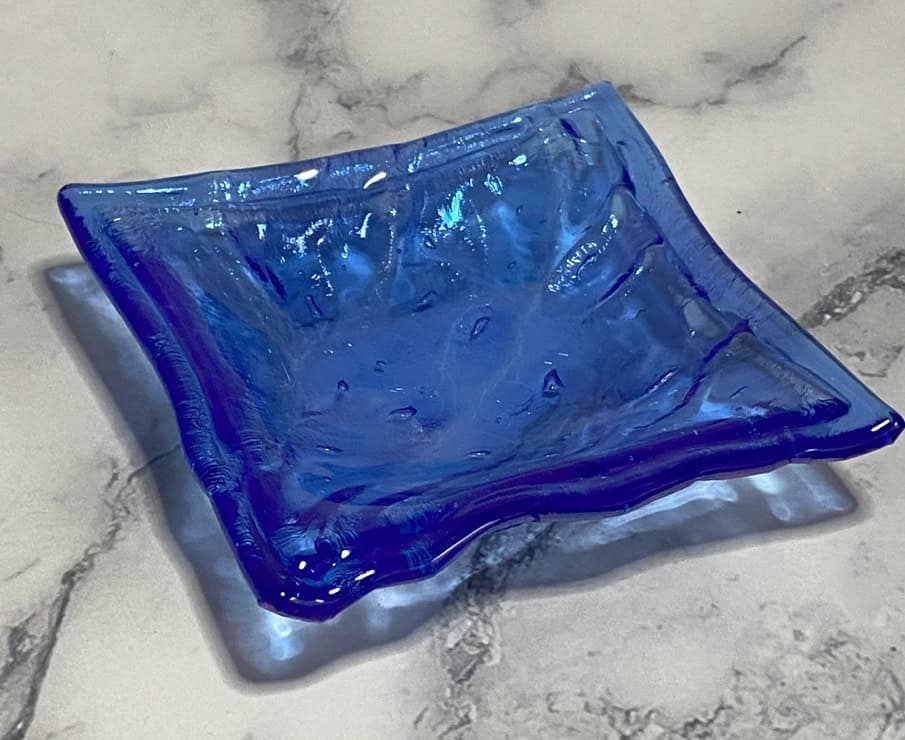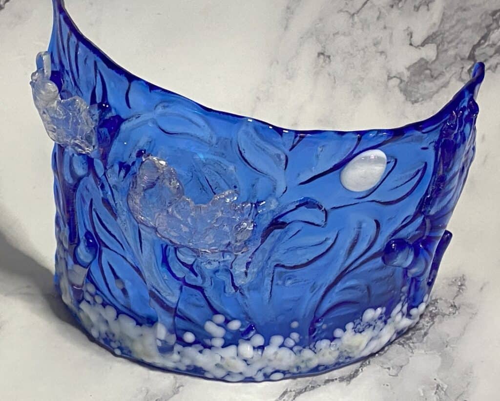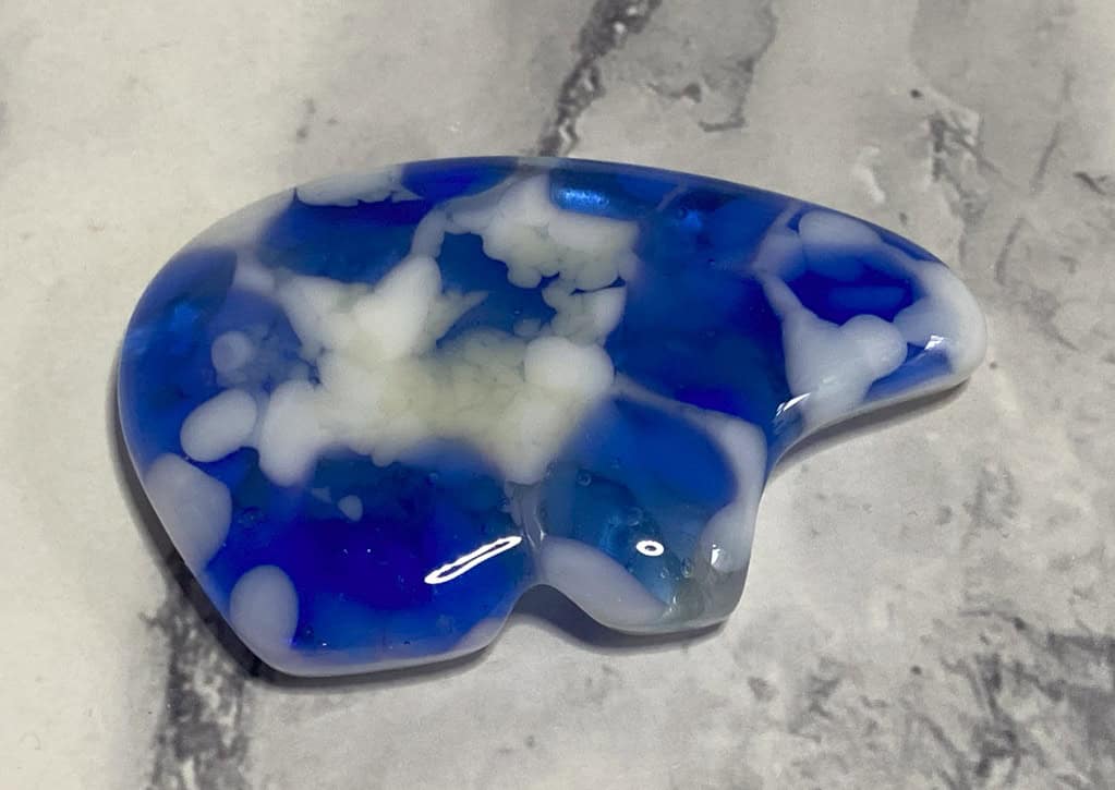 One of the things I love most about fused glass is its incredible ability to transform—again and again. A few months ago, I shared a blog post about the vase in the first picture (and another piece that was a beautiful shade of blue, though I can’t seem to find the photo of that one!). From that broken vase, I created several new artworks, including a stand, a casted bear, two votives, a dish, and a sconce—and let me tell you, the sconce is always a crowd favorite!