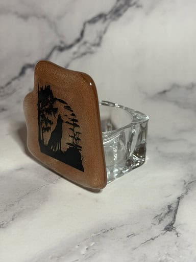 I loved the organic shape of this piece of copper glass, so I turned it into a beautiful votive featuring a screen-printed wolf. The shape, the texture, and that rich copper reaction all work together perfectly. When the candlelight shines through, it has such a warm, wild, and rustic glow. Isn’t it just perfect?