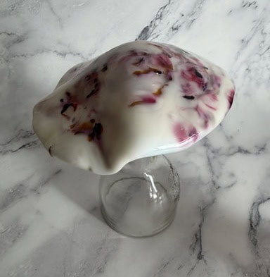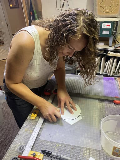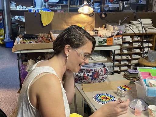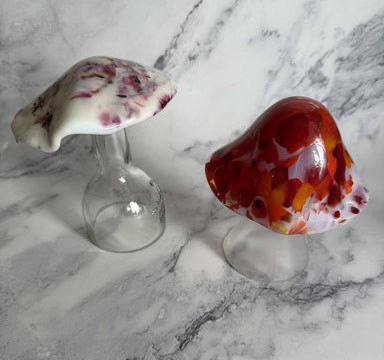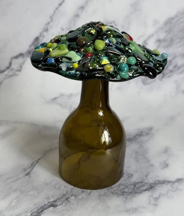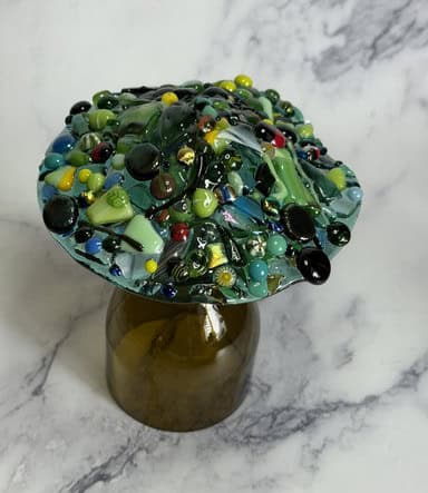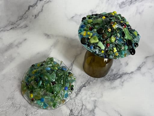 Tara was the first to dive in (and can we take a moment to appreciate her dress—it was fabulous!). She came to class with a clear vision: she wanted to make mushroom night lights. She even brought along inspiration photos, which showed me just how excited she was about this project. Normally, I don’t let students make mushrooms, since the cap is a pretty advanced, multi-step process. But I’ve been toying with the idea of offering a mushroom-themed class, and Tara turned out to be the perfect person to try it with. She became my very first mushroom student—and wow, did she set the bar high! We began by cutting the circle, and then she went all in decorating it, adding wonderful layers of glass that gave her piece so much depth and character. I’ll admit, I was a little nervous about firing it—too many layers can be tricky in the kiln—so I made a practice cap of my own (you can see it in the third picture). I even slumped it to double-check that my schedule would hold up. In the fourth picture, you can see Tara’s mushroom cap next to mine, and honestly, hers turned out amazing. I couldn’t be prouder of her work. Not only did Tara create something unique and beautiful, but she also helped me take the first step toward a possible mushroom class in the future. What a fantastic way to kick off this session!