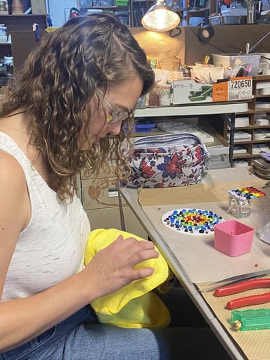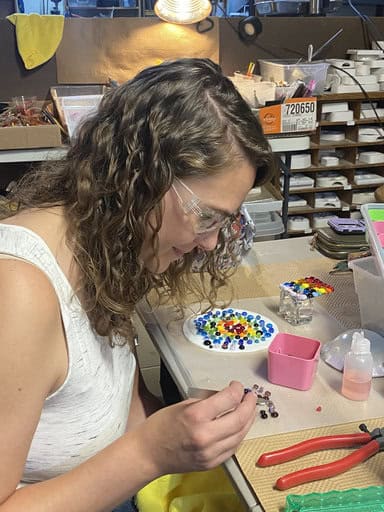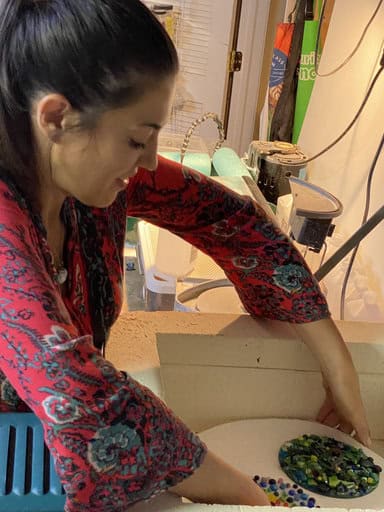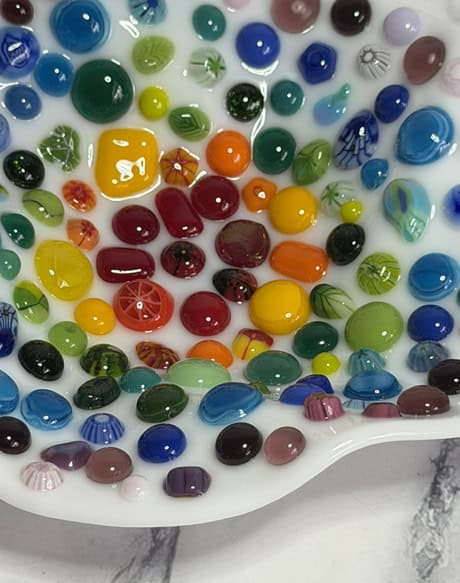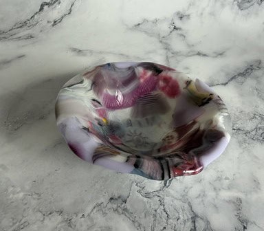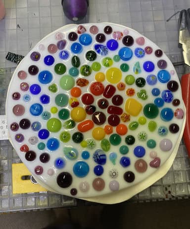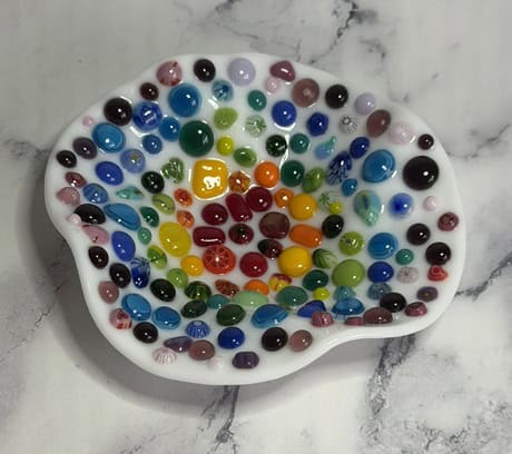 Vanessa had taken a fused glass class with me before, so she came in with a bit of experience under her belt. Just like Tara, she brought along an inspiration piece—a small bowl that used an advanced technique. While she didn’t plan to replicate the technique, she loved the shape and wanted to create her own bowl in a similar shape. She cut her circle by hand (which takes patience and precision), then carefully ground it smooth before moving on to the fun part—decorating. Vanessa has such a great eye for design, and I loved the choices she made. With dots and murrine placed across the surface, her piece developed this vibrant, rainbow-like appearance that feels both cheerful and sophisticated. The end result was a bowl full of character and color, one that shows off her growing skill and confidence with fused glass. It was such a joy watching her bring her inspiration to life in her own unique way.