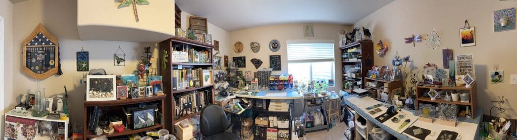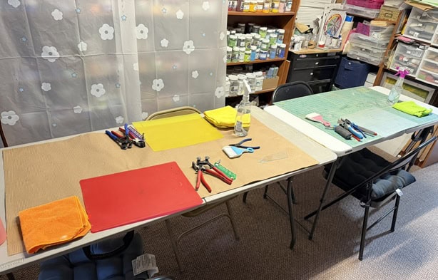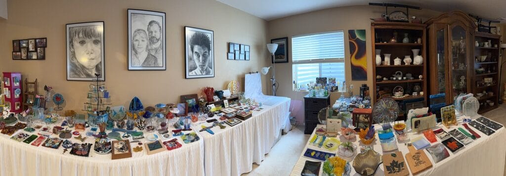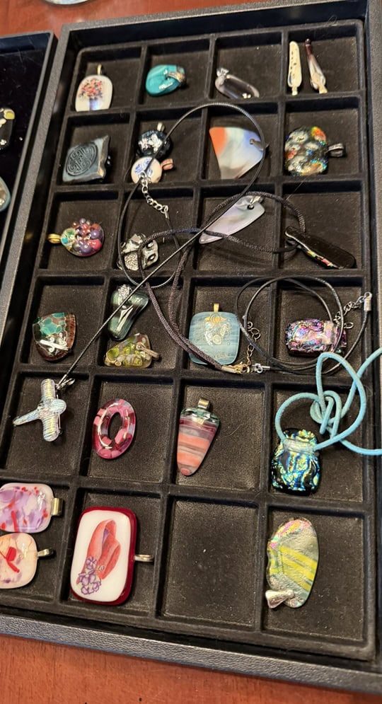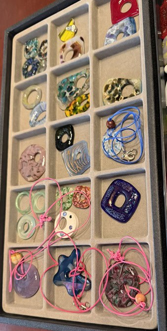 • The Finished Room — is filled with completed fused glass artwork available for purchase, and it truly gives students a sense of just how versatile this art form can be. From florals and landscapes to jewelry and functional pieces, the variety always surprises them. It’s one thing for me to describe the possibilities — it’s another thing entirely to see them displayed right in front of you.