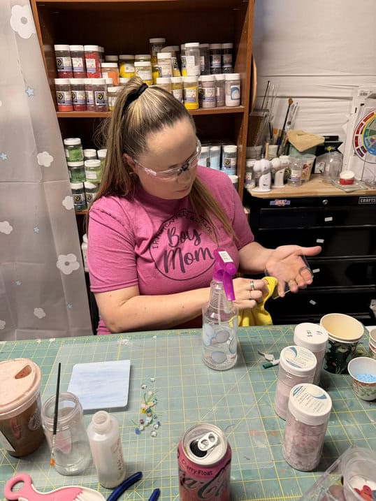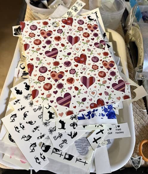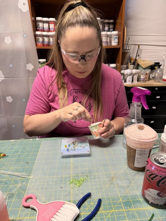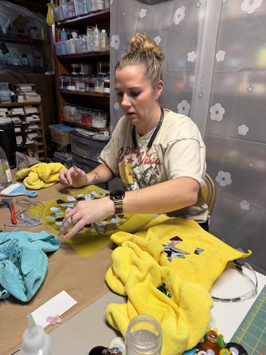 Before wrapping up, all three students — Kendra, Nicki, and Erin— took advantage of one more creative opportunity. Occasionally, I offer students the chance to make a smaller fused glass piece — a pendant, magnet, or keychain — using my cabochons and decals. It’s such a fun option because it allows them to experiment with imagery and layering on a smaller scale. Each of them created beautiful pendants, and it was so fun to watch their personalities come through in those tiny pieces. There’s something especially satisfying about working small. You focus more on detail, composition, and that perfect little “pop” that makes the design shine. I loved watching them sort through the cabochons and decals, holding different combinations up to the light and deciding what spoke to them. Those quiet, thoughtful moments are just as rewarding as seeing the finished pieces come out of the kiln. Kendra made a Key Chain, Nicki made a magnet, and Erin made a car pendant. And truly, every single one turned out beautifully.
