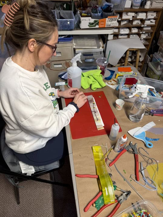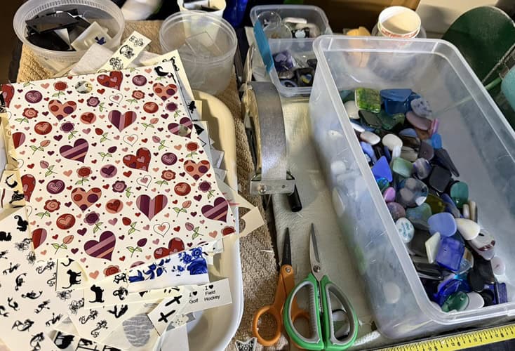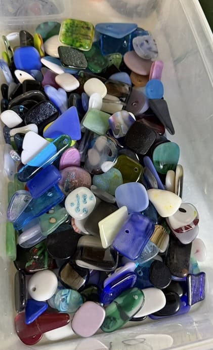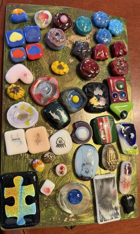 Since this was my afternoon class, I had picked up and completely reset the studio after the morning group. Fresh tables, refreshed supplies, everything ready for a new wave of creativity. I always love that reset — it feels like a clean slate and a brand-new beginning. By the time we made our way back to the main studio, the nerves were gone, inspiration was high, and everyone was ready to create. The tables were laid out with an abundance of supplies — murrine, dots, transparent and opaque glass, vitrigraph, and plenty of frit — giving them more than enough options to explore. There’s something magical about that moment. Students walk up to the table, take it all in, and you can almost see the wheels turning.