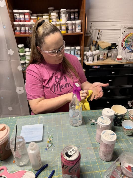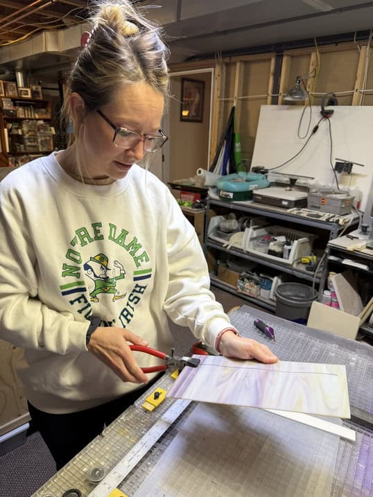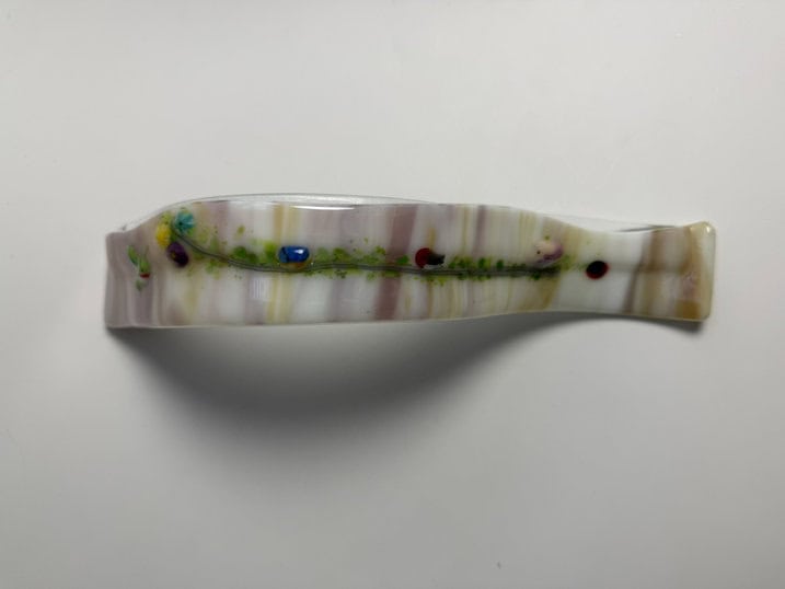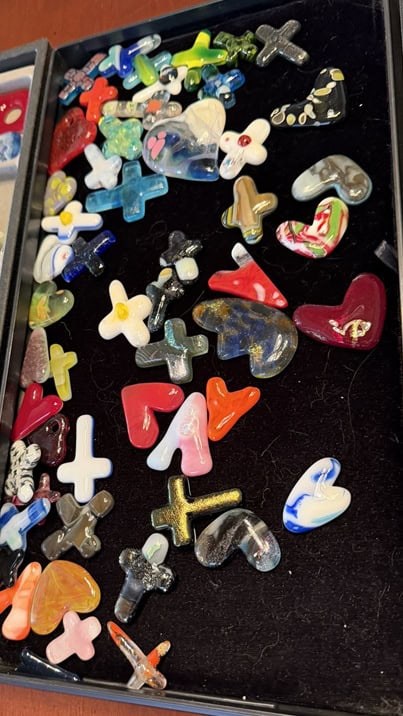 I had fabulous class this month with Kendra, Nicki, and Erin— all new to fused glass. I always love welcoming beginners into the studio. There’s something special about that first experience. As always, we began by reviewing studio safety and completing the required liability forms. Once the paperwork was handled, I moved on to one of my favorite traditions — surprising each student with a free gift. They were able to choose from magnets, stirrers, pendants, pocket hearts, and pocket crosses before diving into their projects. I never get tired of watching students select a small piece of glass art to take home before they’ve even started creating. It sets such a warm, generous tone for the day. This time was especially interesting. Nicki and Erin both chose pocket crosses right away. Then when Kendra walked in, she paused, looked at the options, and said, “Oh, I’m choosing a pocket cross.” I couldn’t help but smile. Three brand-new students, all independently drawn to the same piece. Moments like that always feel a little meaningful.