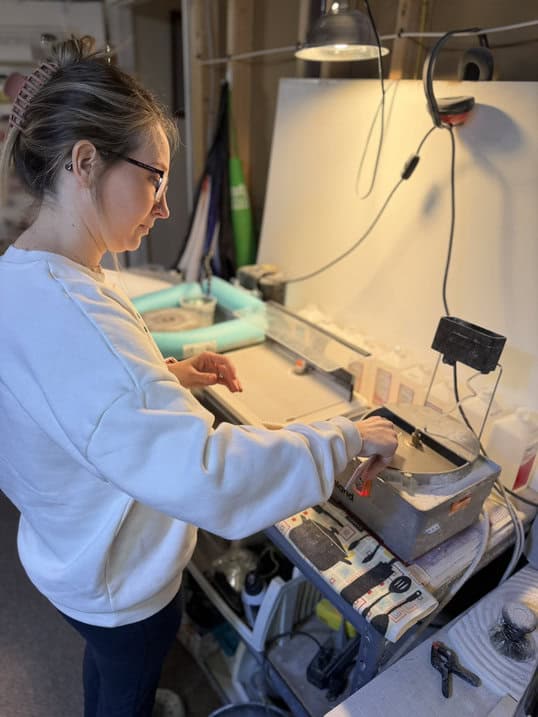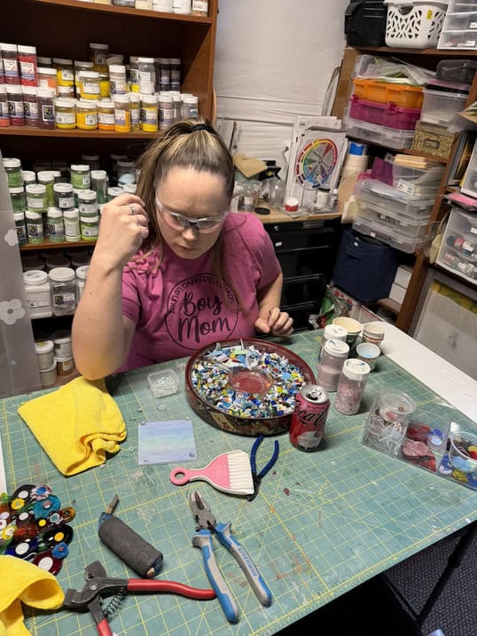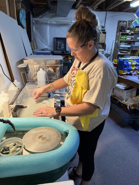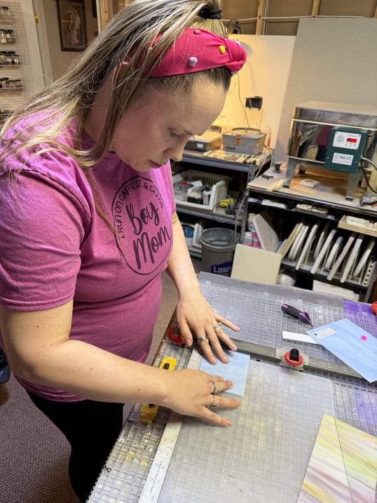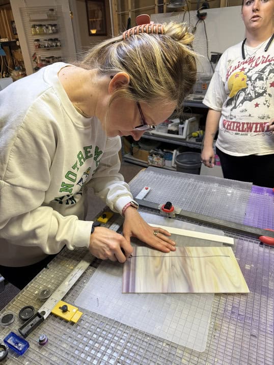 With all three Kendra, Nicki, and Erin visiting my studio for the first time, we began class with a tour. Before cutting glass or choosing colors, I like to walk new students through the spaces so they can get a feel for how I work and see just how wide the possibilities are with fused glass. We explored the studio and my specialty rooms together, talking about different techniques, tools, and finished pieces along the way. I’ve found that starting with a tour helps ease any nerves, sparks inspiration, and allows students to feel comfortable before diving into their own projects. By the time we returned to the main studio, the hesitation was gone and the excitement had definitely taken over.