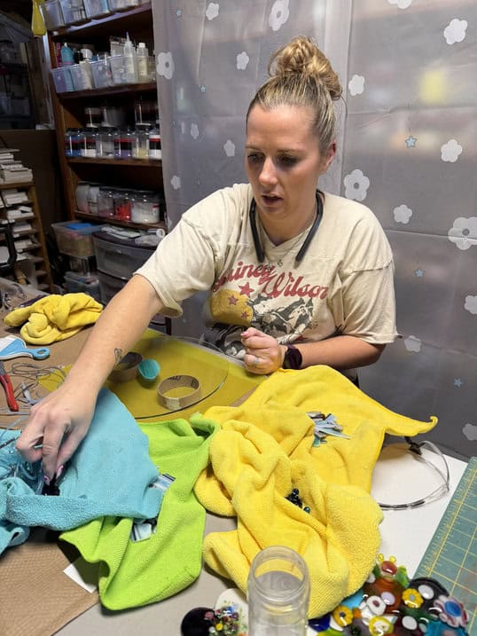 Nicki also decided to make an adorable ring dish — and what a statement it became. She started with the prettiest base glass, then layered in iridized glass for that soft shimmer. As if that wasn’t enough, she added vitrigraph, murrine, and millefiori. For such a small piece, it packed a serious punch. The combination of texture, sparkle, and detail created so much movement and personality. Every time you look at it, you notice something new. It’s one of those pieces that proves size doesn’t determine impact. Absolutely stunning.