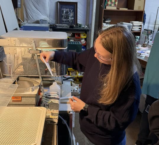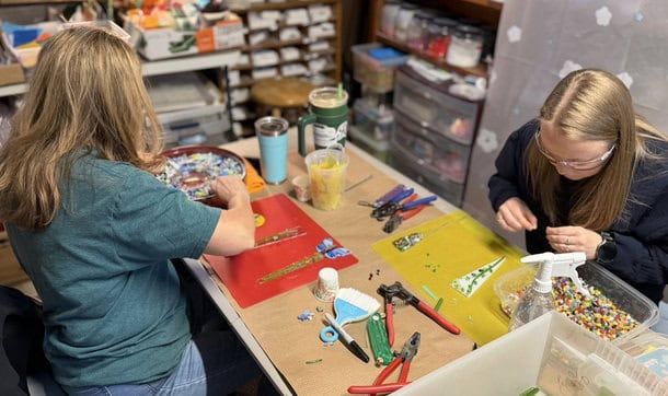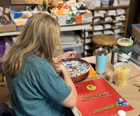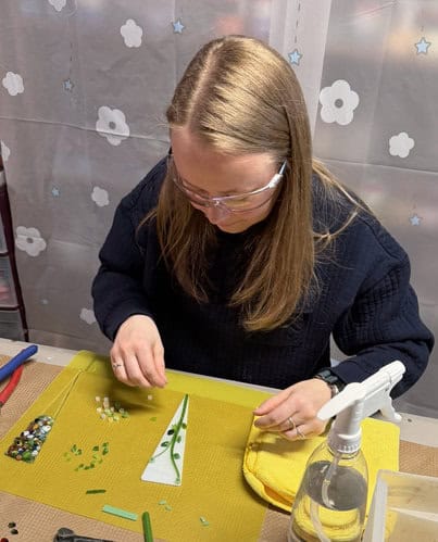 By the time we make our way to the main studio, the nerves are gone, inspiration is high, and everyone is ready to create. The tables were laid out with an abundance of supplies — murrine, dots, transparent and opaque glass, vitrigraph, and plenty of frit — giving everyone more than enough options to explore. There’s something magical about that moment. Students walk up to the table, take it all in, and you can almost see the wheels turning. Hands hover over different colors. Questions start forming. That’s usually the exact point when creativity really takes off. I love watching that shift — when hesitation turns into excitement and ideas begin to take shape. That’s when the real fun begins.