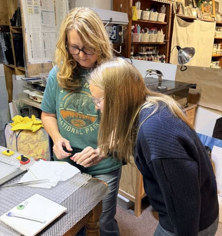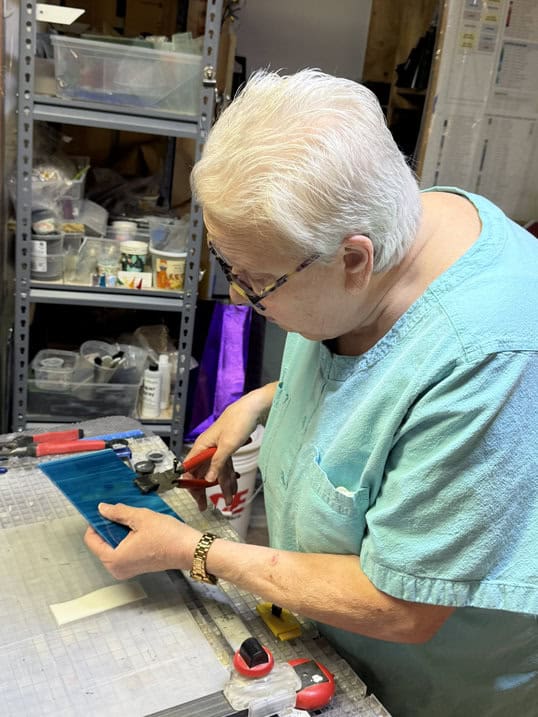 With Ashley and Anita visiting my studio for the first time, we started class a little differently. Before cutting glass or choosing colors, we explored my glass space together. I walked them through my specialty rooms, giving them a feel for how I work and just how wide the possibilities are with fused glass. I’ve found that beginning with a tour helps new students relax, get inspired, and feel comfortable before diving into their own projects. Glenda, of course, didn’t need the grand tour. She’s been here before and knows the layout well — so she headed straight into the studio and got started. I love that confidence.