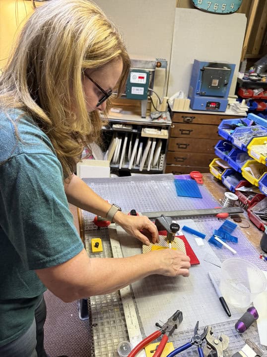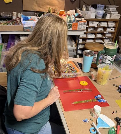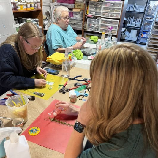This month I had such a wonderful class with two new students, Ashley and Anita, along with a returning student, Glenda. I always love that mix — fresh excitement combined with growing confidence. We began the day the responsible way: reviewing studio safety and completing the required liability forms. Once the paperwork was handled, we moved on to one of my favorite parts — surprising each student with a free gift. They were able to choose from magnets, stirrers, pendants, pocket hearts and pocket crosses before diving into their projects. There’s something so fun about watching them pick out a little piece of glass art to take home before they’ve even started creating. It sets the tone for the whole class — relaxed, generous, and creative. Glenda has taken several classes with me, so after we wrapped up the forms and everyone selected their gift, she headed to the studio.