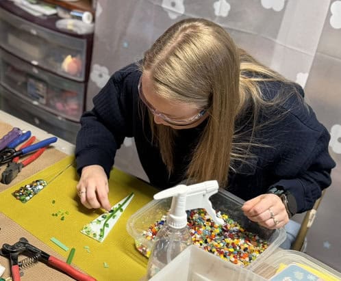 Occasionally, I offer students the opportunity to create a smaller fused glass piece — a pendant, magnet, or keychain — using my cabochons and decals. It’s always a fun option because it allows them to experiment with imagery and layering in a different way. Ashley and Anita both took advantage of it and made some beautiful pendants. There’s something so satisfying about working on a smaller scale. You get to focus on detail, composition, and that little “pop” that makes a piece special. Watching them sort through the cabochons and decals, deciding what spoke to them, was just as fun as seeing the finished results. These smaller projects are perfect because they give students an extra piece to wear, gift, or keep as a reminder of their day in the studio. And honestly, they turned out absolutely beautifully.