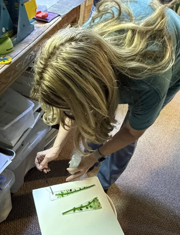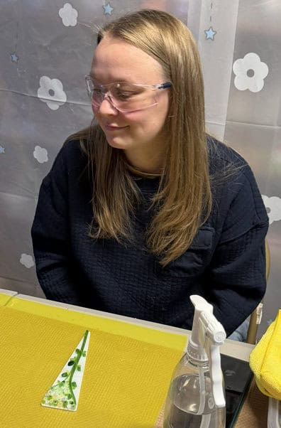 First up was Ashley. She created a beautiful green and white fused glass plant stake — and it truly turned out absolutely lovely. There’s something so timeless about that color combination. The crisp white paired with the fresh green gave it such a clean, simplistic elegance. It didn’t need anything flashy. The design spoke for itself. Meg also got to use my flat lap grinder. That’s always a bit of a rite of passage in my studio. There’s something empowering about shaping and refining your own piece — smoothing the edges, really finishing it with intention. She handled it like a pro and wasn’t intimidated at all. Watching her confidence grow as she worked was one of my favorite moments of the day. From selecting her glass to grinding and refining the final piece, she truly owned the process. And that’s what makes a class so special — not just the finished project, but the experience of creating it.