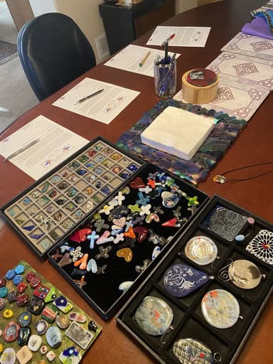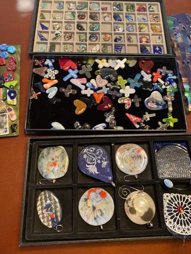 What a fun class this was! We had two brand-new students, Christine and Lisa, joining us, along with two of seasoned fusers, Cindy and Kim. Just like every class, we kicked things off with a safety talk and the liability forms, making sure everyone was comfortable and ready to create. I also laid out a table of free gifts—pocket hearts, crosses, magnets, suncatchers, and a playful mix of pendants—so each student could pick a little thank-you for being there.