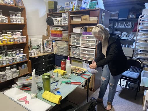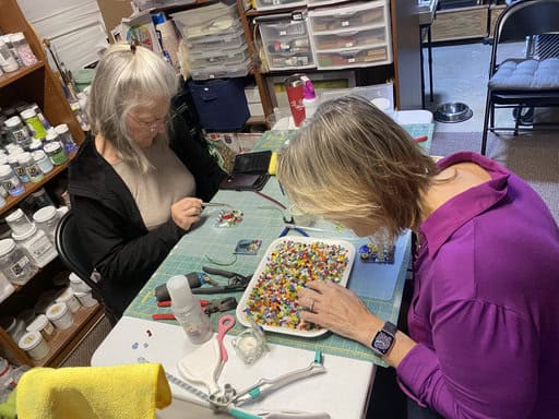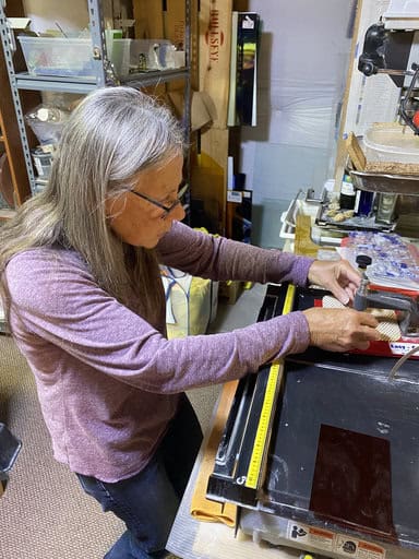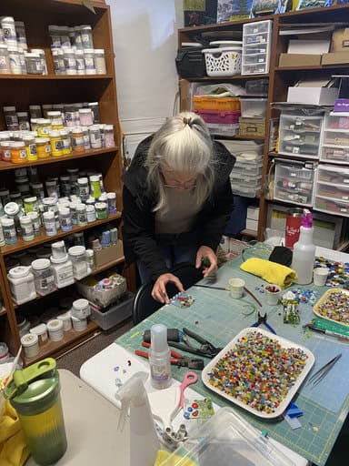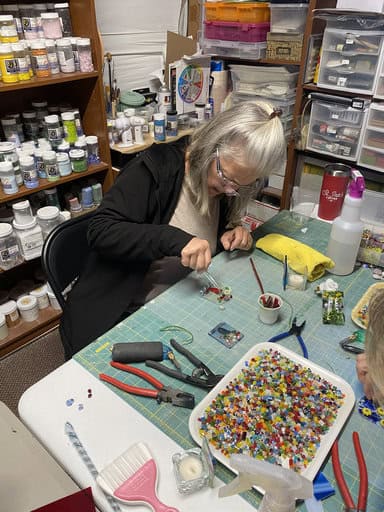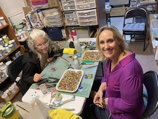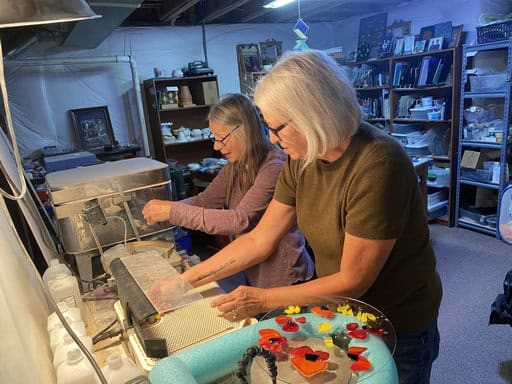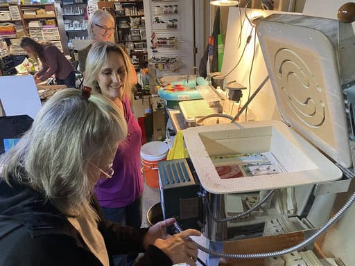 Before diving into our projects, I took the group on a little tour of my fused glass studio. What surprises most people is that it isn’t just one space—it’s really four unique rooms, each with a purpose: cutting, finishing, inspiration, and displaying finished pieces. Walking through them gives students a sense of the variety and flexibility of fused glass, and I love watching their faces light up when they see all the possibilities. Each room has its own personality, and together they tell the story of my creative process.
