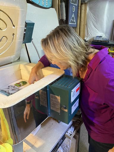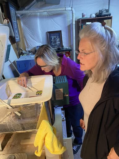 Like her sister Christine, Lisa decided to make a night light, and hers turned out just as fabulous. She started with a base of confetti glass, then added my big sunflower millefiori to create a cheerful garden scene. By shaping it into a dome and adding a tiny ladybug and bee, she gave the piece such charm and personality. I especially loved watching Lisa and Christine place their projects into the kiln themselves—it’s such a fun and memorable part of the process.