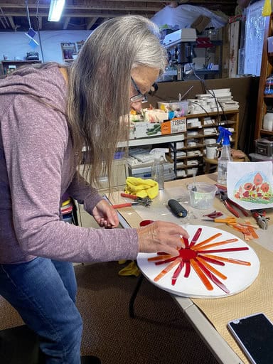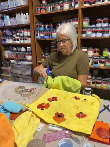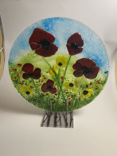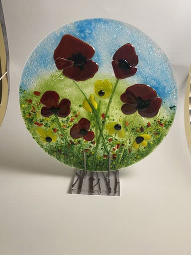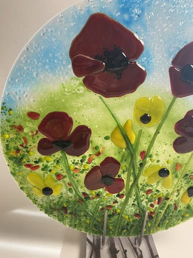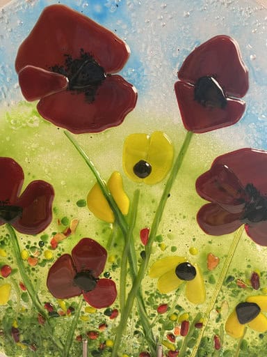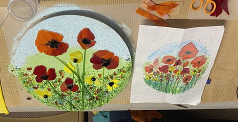 Although Kim has experience with fusing, this was her very first class with me. She arrived with a sketch in hand and asked if we could turn her vision into reality—a large-scale garden art piece. Her inspiration was poppies, which happen to be one of my favorite flowers too. Together, with some guidance along the way, she brought her design to life in glass. The result was breathtaking, and I couldn’t be prouder of her accomplishment. It’s so beautiful I did my best to talk her into keeping it in the house verse putting it outside.