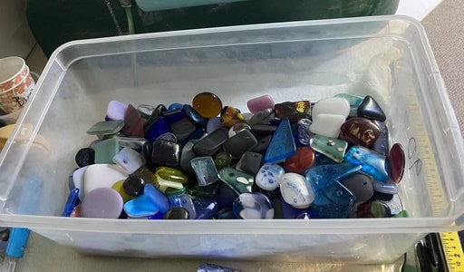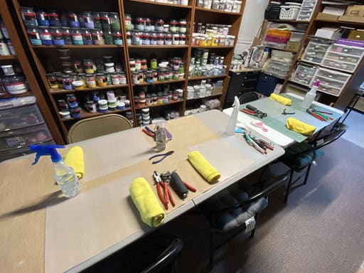 Finally, we stepped into the studio itself. The shelves are full of equipment and supplies, and in the middle is the big table where students sit down to turn their ideas into reality. Because this is my own working studio, it’s packed with treasures—sheet glass, frit, murrine, millefiori, vitrigraph, and so much more. Every student has tools waiting for them, so they can dive right into the fun of creating.