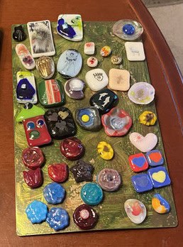 At the end of class, I introduced the ladies to the fused glass decal technique. It’s one of my favorite “bonus” activities because it lets students make something small and personal, like a pendant, magnet, or keychain. The table was spread with decals and cabochons for them to choose from, and it was wonderful watching them pick designs that spoke to them. These little extras are not only fun to make but also give everyone an extra piece of art to take home.