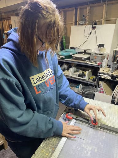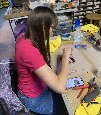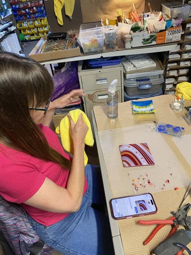First up was Christina. She chose to make a photo stand inspired by one of the pieces I had created. Using frit, murrine, and millefiori, she built a design that is both beautiful and functional. I love these photo stands so much that I even keep one in my home in Westcliffe—they make fantastic gifts and are a joy to use.