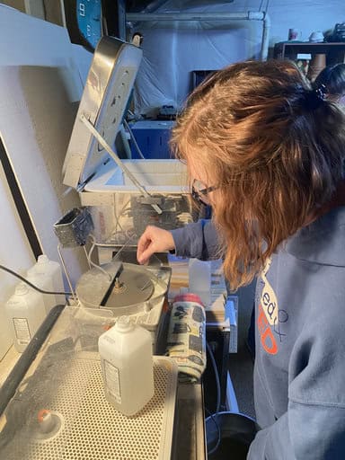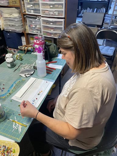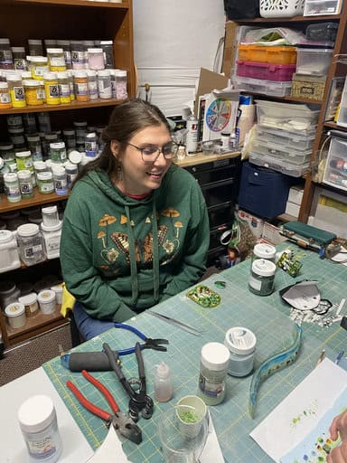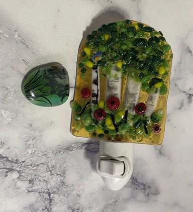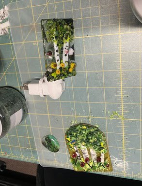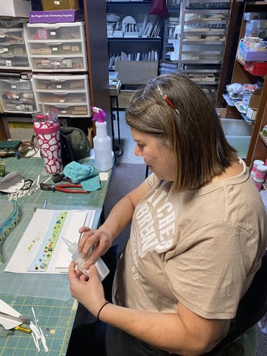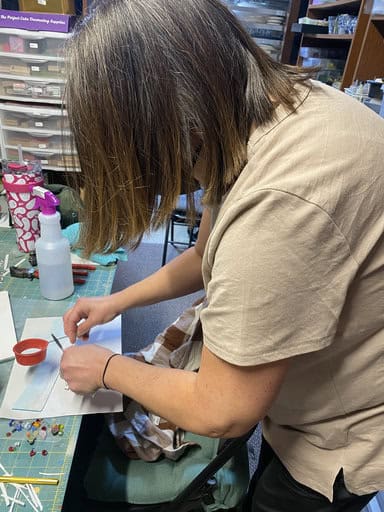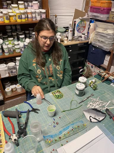 Chelsa didn’t waste a moment—she came in with a clear idea and drew inspiration from one of my nightlights. Her project turned into a gorgeous spring aspen design, complete with millefiori, frit, and my little aspen element. Watching her put it together was a joy, and the finished piece is simply stunning.