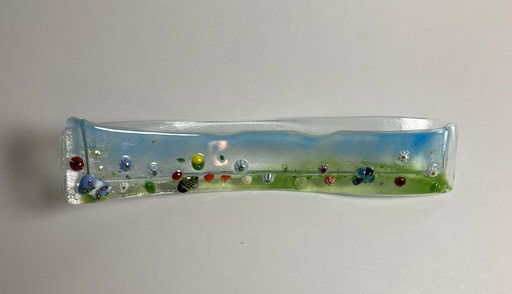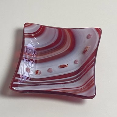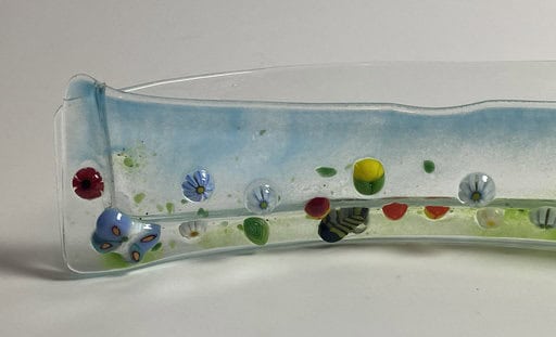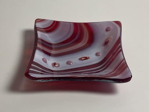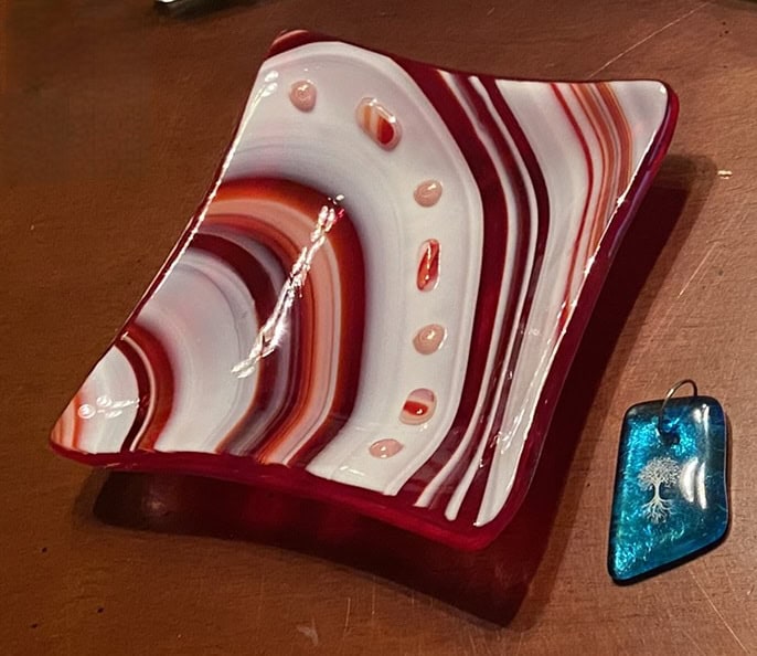 The next project was Lisa’s, and she created a dish that proves simple can be spectacular. The glass she chose was gorgeous on its own, and she added just a few pieces of murrine for extra detail. After cutting, we fused and slumped it into a lovely, functional shape. What I love about dishes like this is their versatility—they can be used as spoon rests, trinket or jewelry holders, soap dishes, tea bag caddies…the list goes on!