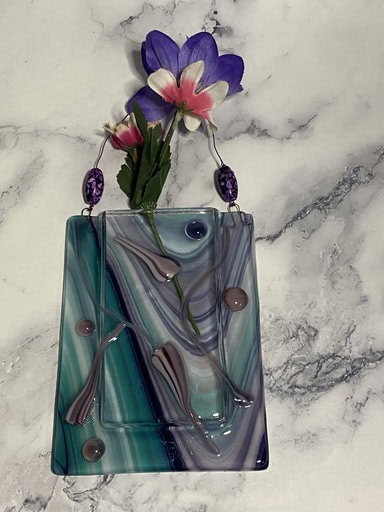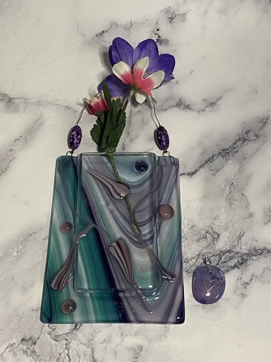 The final project belonged to Alisha, who set out to make a pocket vase. Typically, students decorate these with flowers, but as I was showing her how to build the shapes, I noticed she didn’t look happy. I asked her what was wrong, and she smiled and said, “I don’t want flowers.” That was all I needed to hear! I asked about her favorite colors, and when she answered teal, I pulled out a handful of stunning teal glass sheets. She picked a favorite, added accents of vitrigraph and dots, and created a pocket vase that turned out simply gorgeous.