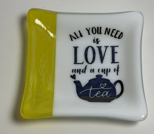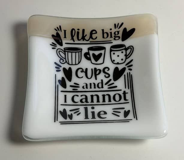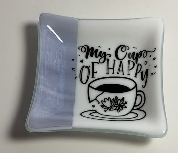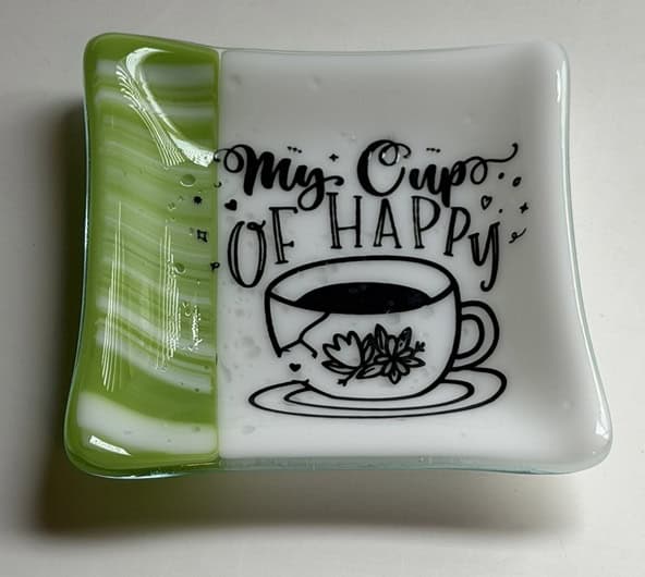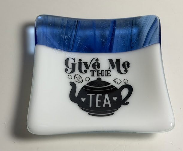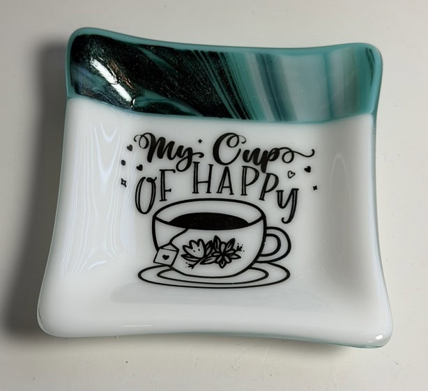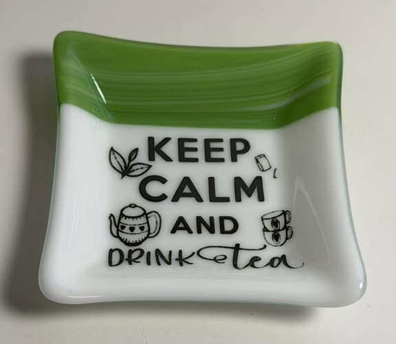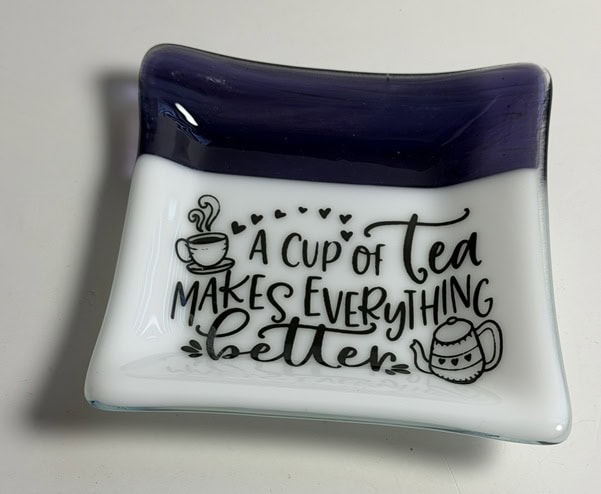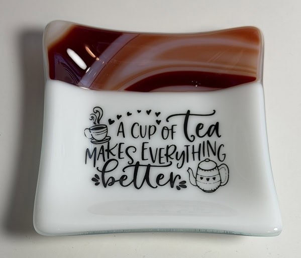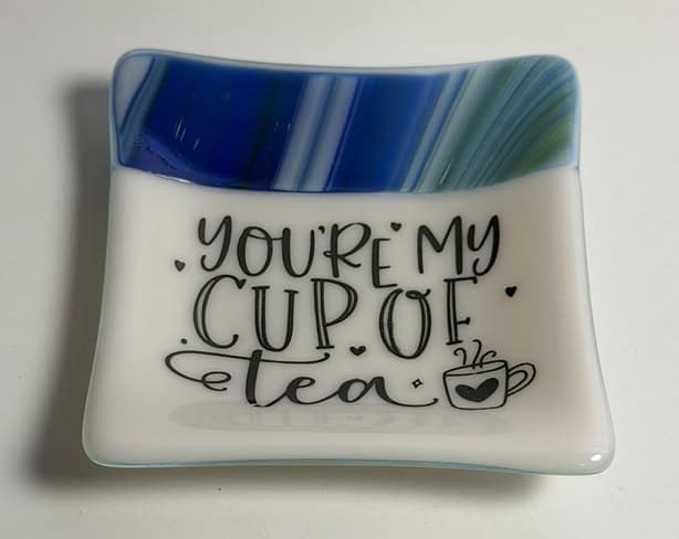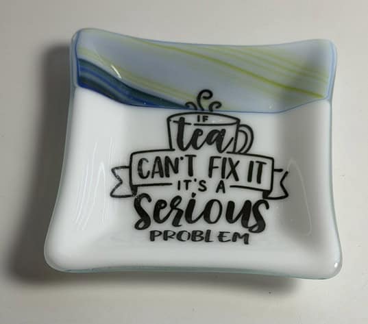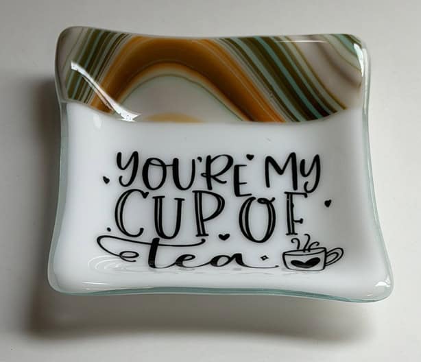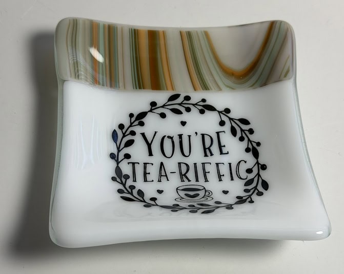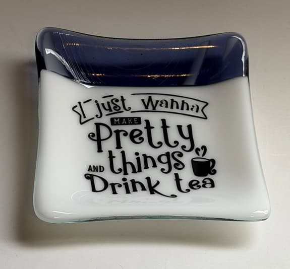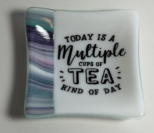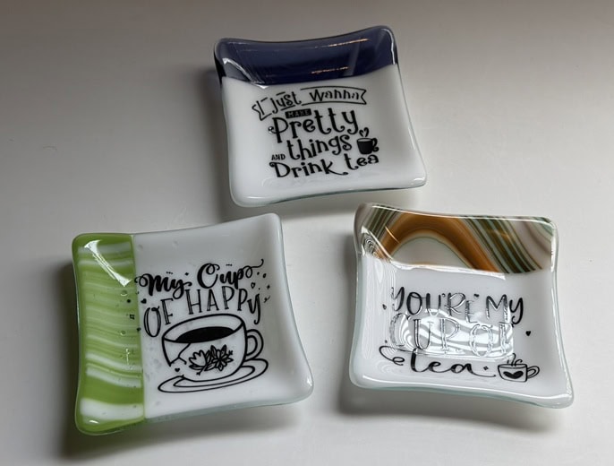 I recently brought some of my newest fused glass tea dishes over to FestiviTea, and I’d truly love it if you’d stop by and support this wonderful little shop. I just love making these tea dishes, and these newest ones make me especially happy. In this first group, the color is layered on top, with the hand screen-printed tea saying on the bottom, creating so much depth and interest when the light hits them. Aren’t they beautiful? I’m always excited to see how each one turns out, and I couldn’t be happier with how these came together.