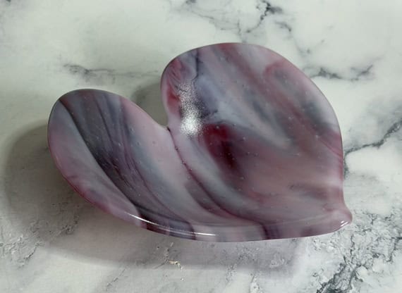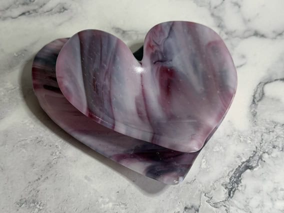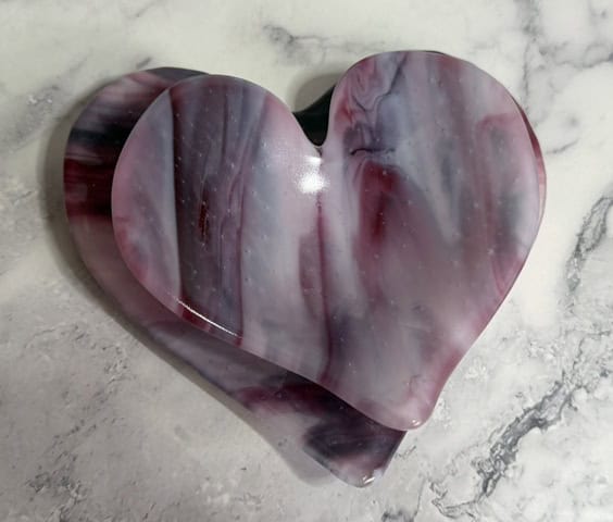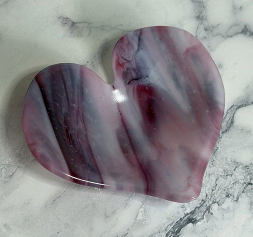 One of my goals this year is to start incorporating more of my special glass into my work. This piece features a beautiful production glass with soft, flowing pink tones that immediately drew me in. Layers of blush, rose, and deeper magenta move together almost like brushstrokes, giving the glass a painterly, expressive quality. Many pink glasses—like those from Bullseye—are created using gold in the formula, which is one of the reasons these colors tend to be more expensive than other sheet glass. Achieving consistent pinks is also more complex during production, which adds to both the cost and the uniqueness of each sheet. It’s one of those materials that feels a little extra special every time you use it. It feels especially suited for hearts—there’s a natural warmth and emotion in these colors that makes each piece feel a little more personal. No two turn out exactly the same, which is part of what makes this glass so special to work with.