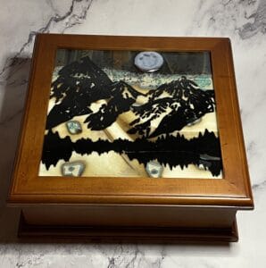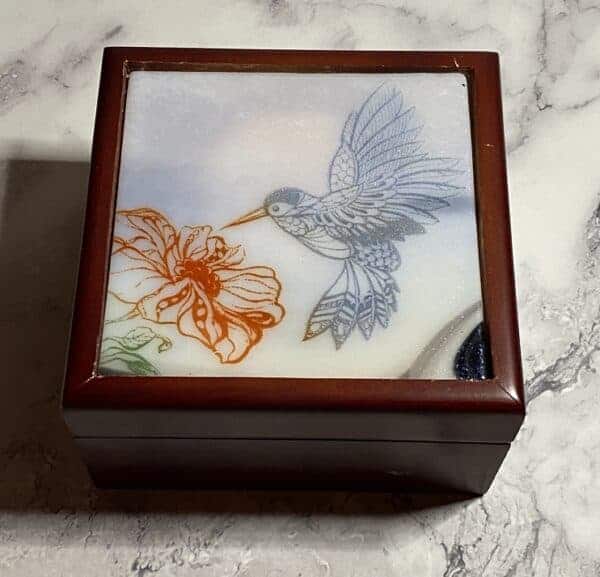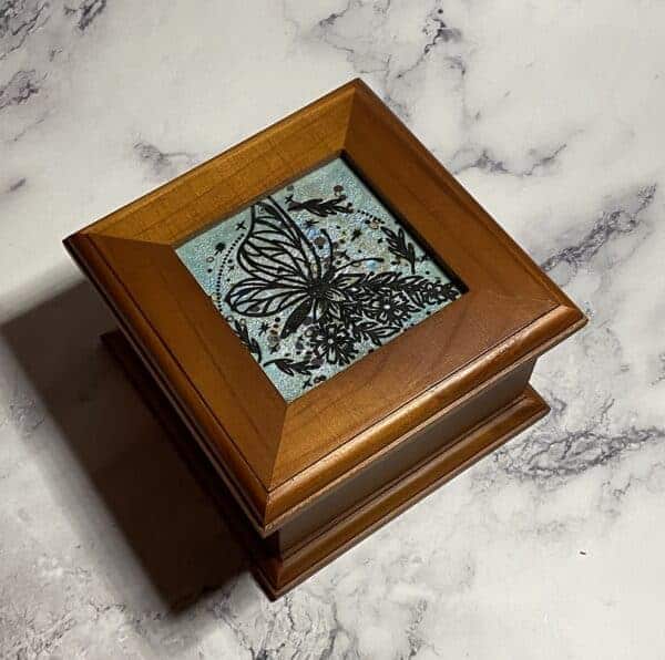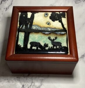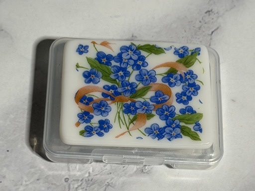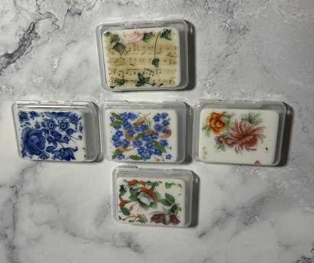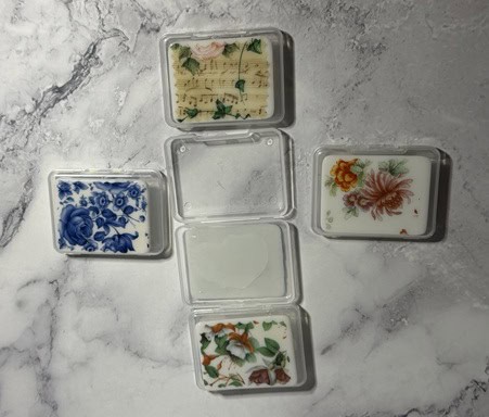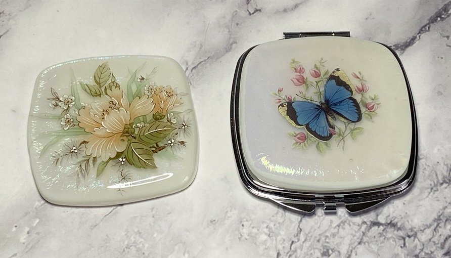 These small decorative boxes are one of my favorite projects. The glass pieces on top are made using decals fused onto glass, which create beautiful, detailed designs in a very small space. I enjoy choosing different images and patterns because each one gives the box its own character. They’re perfect for holding small pills, mints, jewelry, stamps, or other little treasures. They also make wonderful gifts. For this batch, I fused the decals onto glass first and then attached the finished pieces to small plastic boxes. I’ll share more about my recent decal adventures in another blog soon