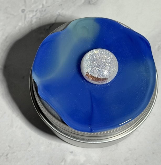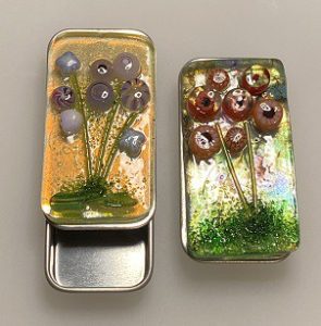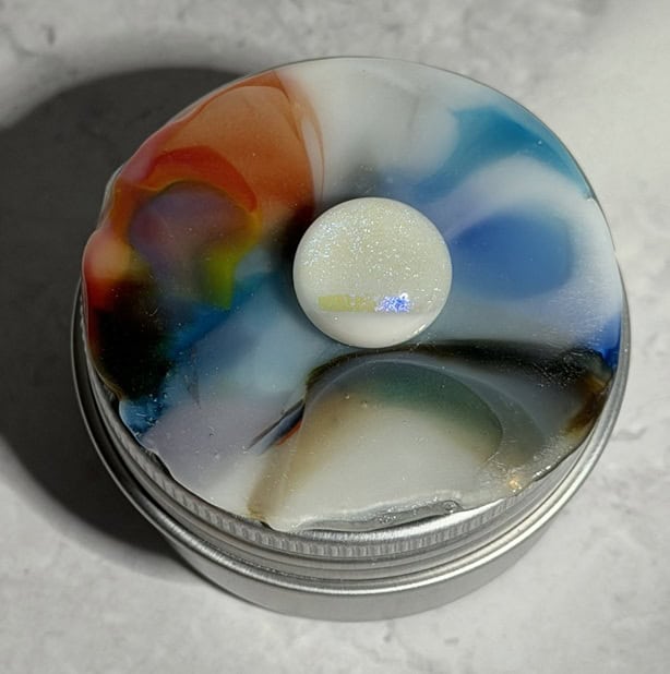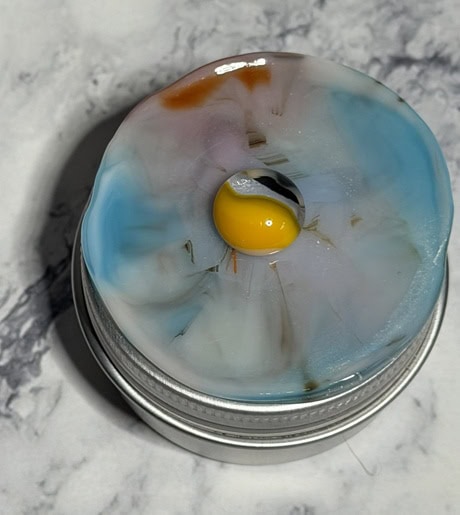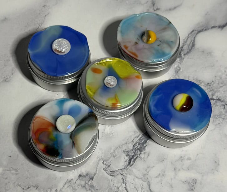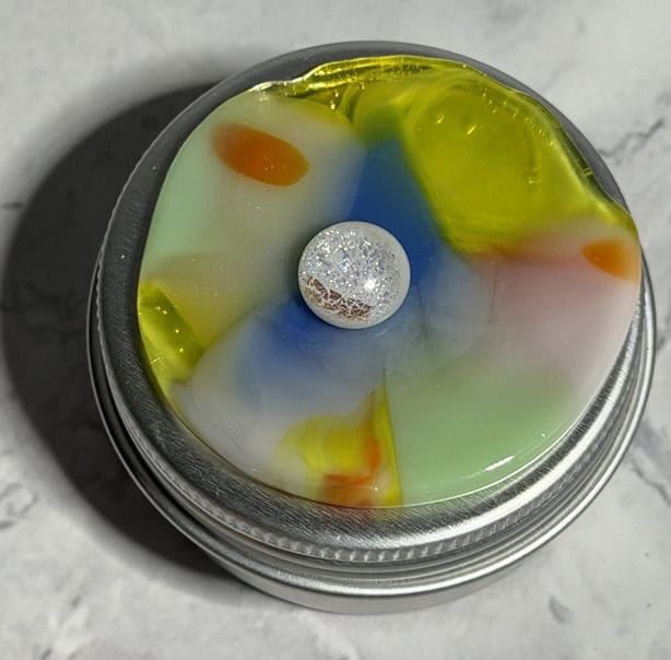 In addition to the little boxes above, I also added pressed glass pieces to these small round tin containers. I love how the glass instantly transforms a simple tin into something colorful and unique. Each piece of glass has its own personality depending on the colors, patterns, and shapes that emerge during the firing process. Some of these have soft blends of color while others have bold, bright accents. These little tins are perfect for holding small items like lip balm, mints, pills, or even tiny treasures you want to keep safe. They’re simple, practical, and just a fun way to add a little fused glass art to everyday objects.